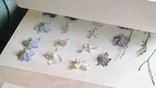 - Разложите цветы в один слой и положите их на доску (картон, фанера), застеленную рисовыми салфетками, газетной, офисной или папиросной бумагой.