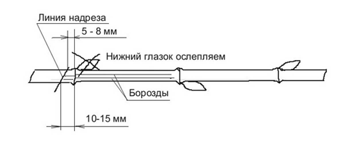 Подготовка черенка: обновить срез, ослепить нижнюю почку, слегка поцарапать ножом