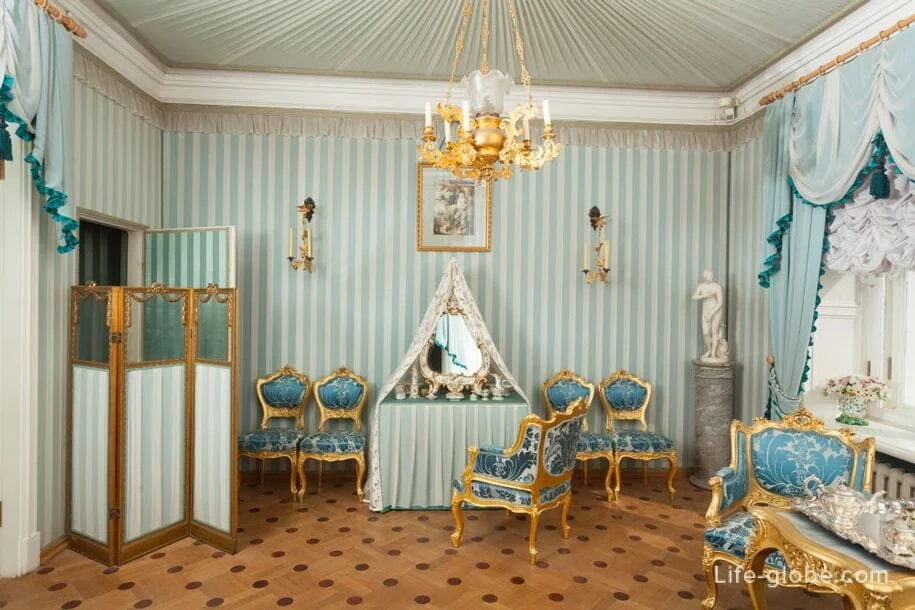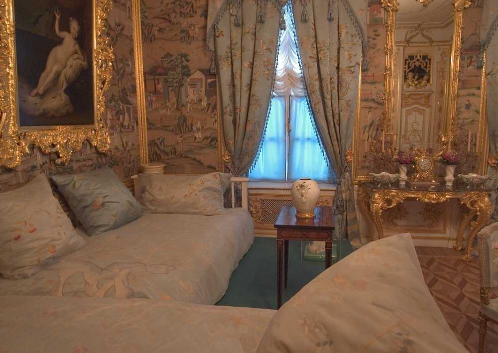 Спальня изолирована от Парадного зала, вход возможен через Морской кабинет. Спальня императора, с детства любившего небольшие помещения, – образец дворцового интерьера. Ощущение теплоты и уюта достигается хорошим освещением комнаты.