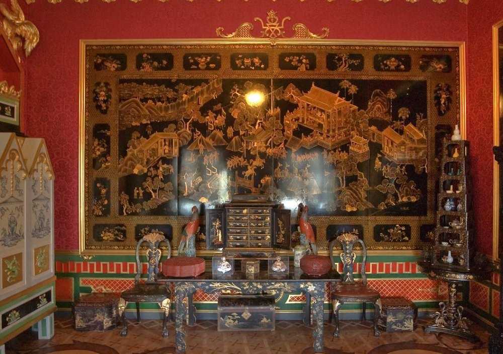 Китайский кабинет (Лаковый кабинет). Для размещения коллекции китайского и японского фарфора в Монплезире создан специальный зал, представляющий уголок Востока, – Лаковый кабинет.14 иконописцев полтора года создавали для кабинета одиннадцать больших вертикальных чернолаковых панно с изображением сцен восточного быта.