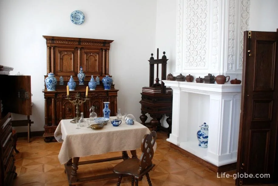 В опрятной Кухне – посуда, оформленная на голландский манер. В каменную раковину для мытья посуды вода подавалась по трубе из фонтана Сноп.