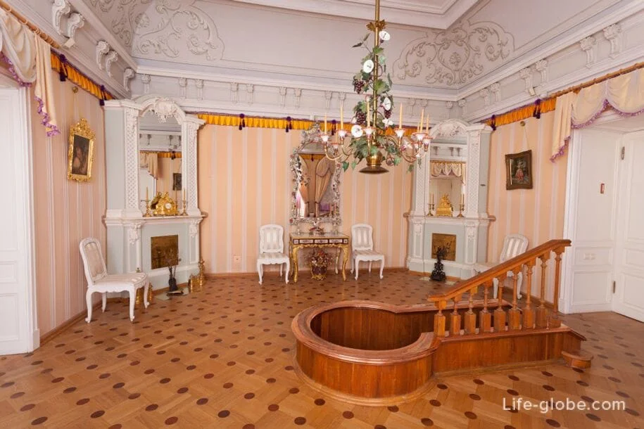 В центре здания – Парадный зал, к которому с одной стороны примыкают Секретарская, Спальня и Морской кабинет. С другой – Китайский кабинет, Кухня, Буфетная.