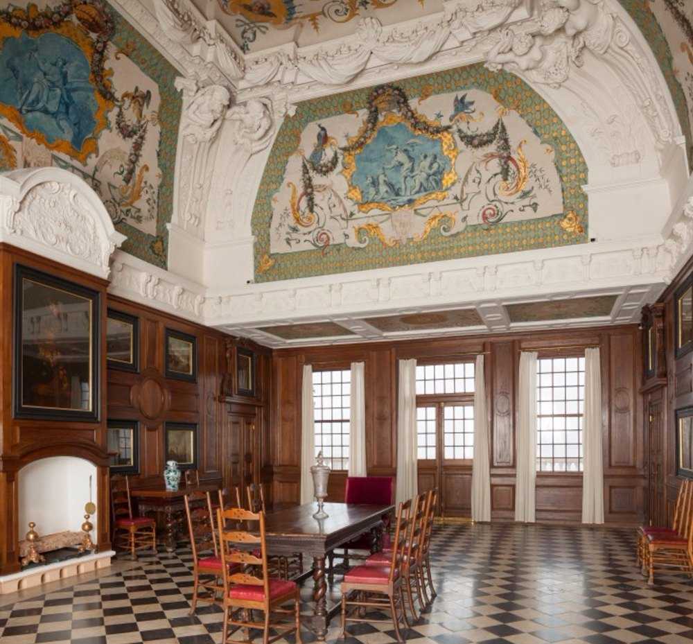 Стены зала на английский манер отделаны вощеным дубом, а пол, подобно шахматной доске, выстилают черно-белые плитки. Над дубовыми панелями находится неширокая кромка потолка, которая отделяет стены и большой купол. Он поднимается над центральной частью зала и делает помещение просторным и торжественным.