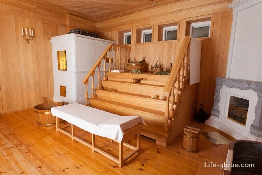 Паровая комната с вещами для банных процедур использовалась по назначению. Пол выстлан гладко обструганными сосновыми плахами, потолок – из липы. При нагревании помещения липа источает приятный медовый запах. В углу – шайка для веников и ушат, рядом расположилась печь с лежащими на ней ядрами. Их нагревали и поливали водой, добиваясь нужной температуры в парной.