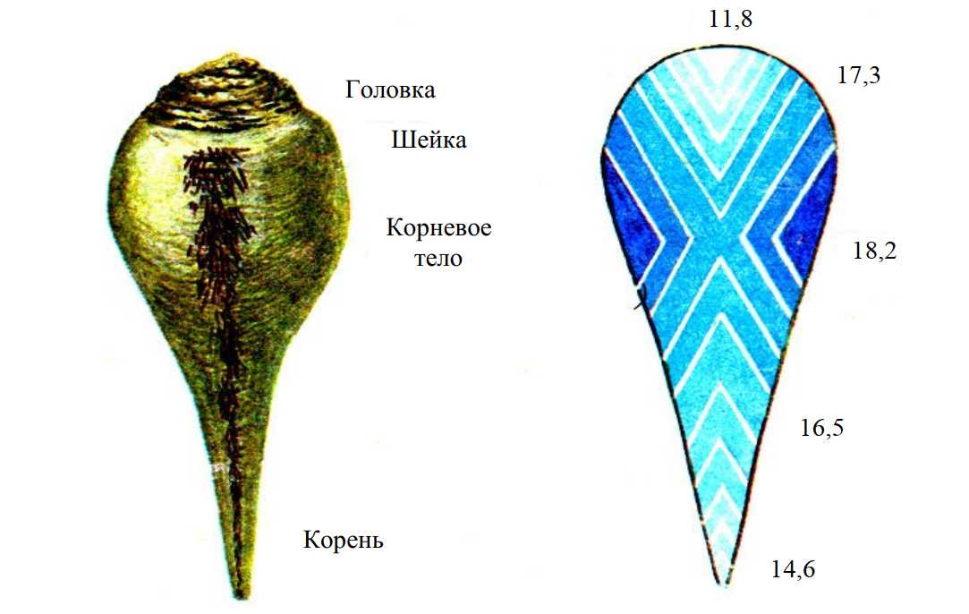 В различных частях корнеплода содержится неодинаковое количество сахара. В вертикальном направлении максимальное содержание сахара отмечено в средней части корнеплода. В горизонтальном направлении наименьшее количество сахара находится в центре корня и частях, прилегающих к покровным тканям (рис. 1).