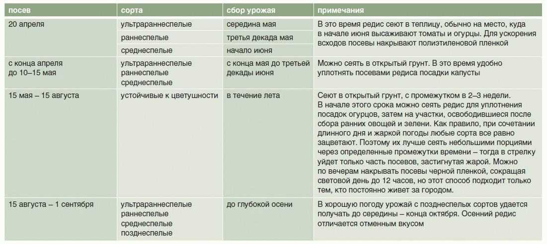 В Подмосковье ее сажают в первых числах апреля, а убирают в конце мая. В основном это ранние сорта зеленой, белой редьки и дайкона. Сеять можно даже в холодную погоду, семена всходят при +2°С.