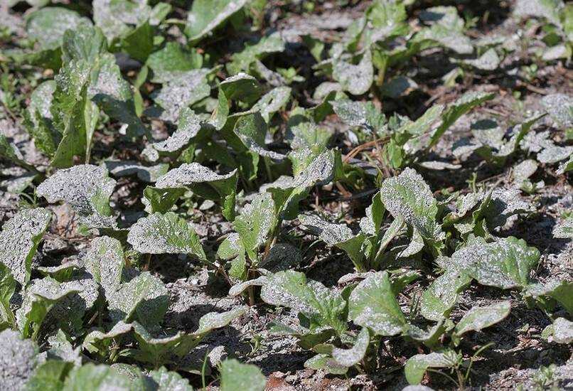 Можно обойтись только древесной золой. Столовую ложку золы высыпают на кустики после первых 3-4 листьев. Спустя две недели повторяют процедуру. Такую периодичность сохраняют все лето, но в дальнейшем увеличивают дозу золы до стакана на 1 кв. м и распыляют ее по почве. За 20 дней до сбора урожая подкармливать редьку прекращают.