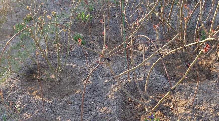 Полотно укладывают на дуги или подпорки, это позволяет распределить снежную нагрузку. С кустов удаляют листья и пригибают. Почву покрывают мульчей из смеси сухих опилок и конского навоза.