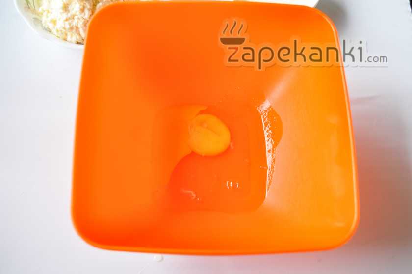 1. Куриное яйцо промываем, вытираем бумажным полотенцем. После этого вбиваем яйцо в миску. Можно, кстати, отделить белок от желтка, отдельно взбить его, а затем добавить в готовую творожную основу. В таком случае запеканка выйдет еще более воздушной и нежной. Но если времени на приготовление немного, используем сразу и белок, и желток.
