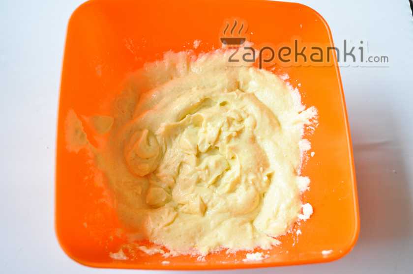 - Смешайте тесто с белками.