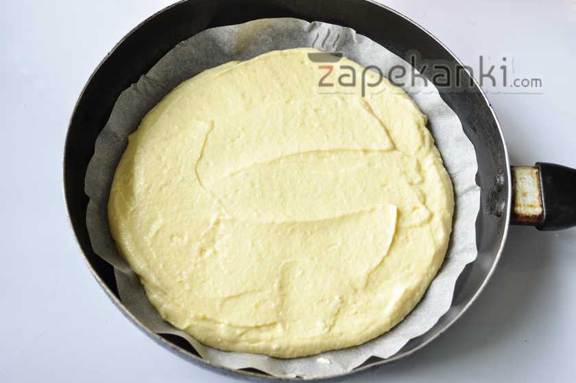 8. Выпекаем творожную запеканку на сковороде, на дно которой выкладываем пергаментную бумагу. Многие рекомендуют просто смазывать сковороду маслом и уже потом выпекать десерт, но если не уверены в качестве антипригарного покрытия сковороды, лучше использовать пергамент. В противном случае запеканка может прилипнуть и ее трудно будет извлечь. Подложка из пергамента должна слегка перекрывать стенки сковороды. Будьте аккуратны, чтобы кончики пергамента не торчали из сковороды — они легко могут загореться. Итак, в сковороду выложим пергамент и на него творожное тесто. Ягоды или же фрукты желательно в эту запеканку не добавлять, так как они пустят сок и, в таком случае, запеканка точно прилипнет или еще того хуже, пригорит.