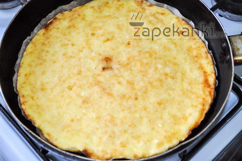 А чтобы запеканка еще и сверху была покрыта поджаристой золотистой корочкой, ее можно аккуратно перевернуть через 20-25 минут. Для этого резко и аккуратно переворачиваем выпечку со сковороды на блюдо, а затем перетаскиваем обратно на сковороду.