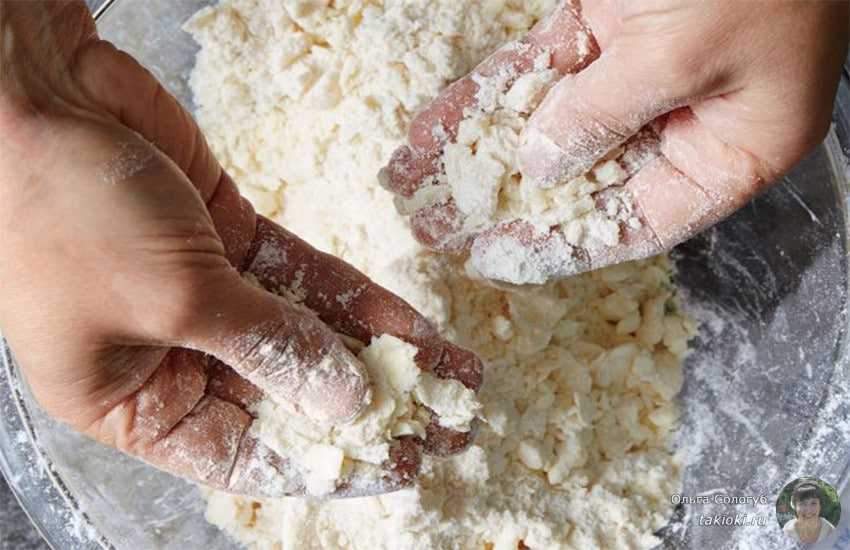 Творожок соединяют с оставшимися яйцами и сахаром, добавляют соду, погашенную уксусом, тщательно вымешивают до густого, эластичного состояния.