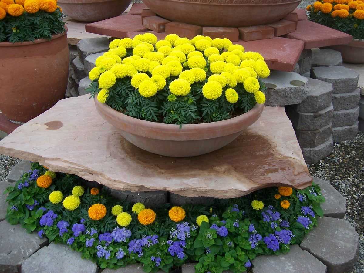 - Посаженные в горшки или другие контейнеры, низкорослые бархатцы послужат ярким украшением балконов или зоны крыльца.