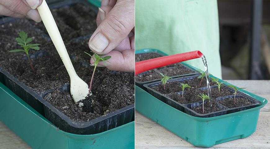 Наполните кассеты смесью, немного уплотните её, сделайте углубления такой величины, чтобы корни свободно в ней размещались Если корни слишком длинные, их можно немного укоротить. При пикировке сеянцы бархатцев нужно заглубить на 1 см.