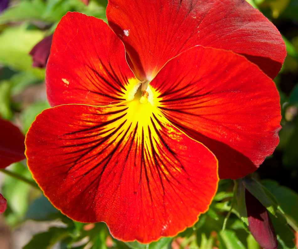 Виола Красная – на прямых стеблях распускаются ярко-красные цветочки, в середине лепестков находится желтые глазок.
