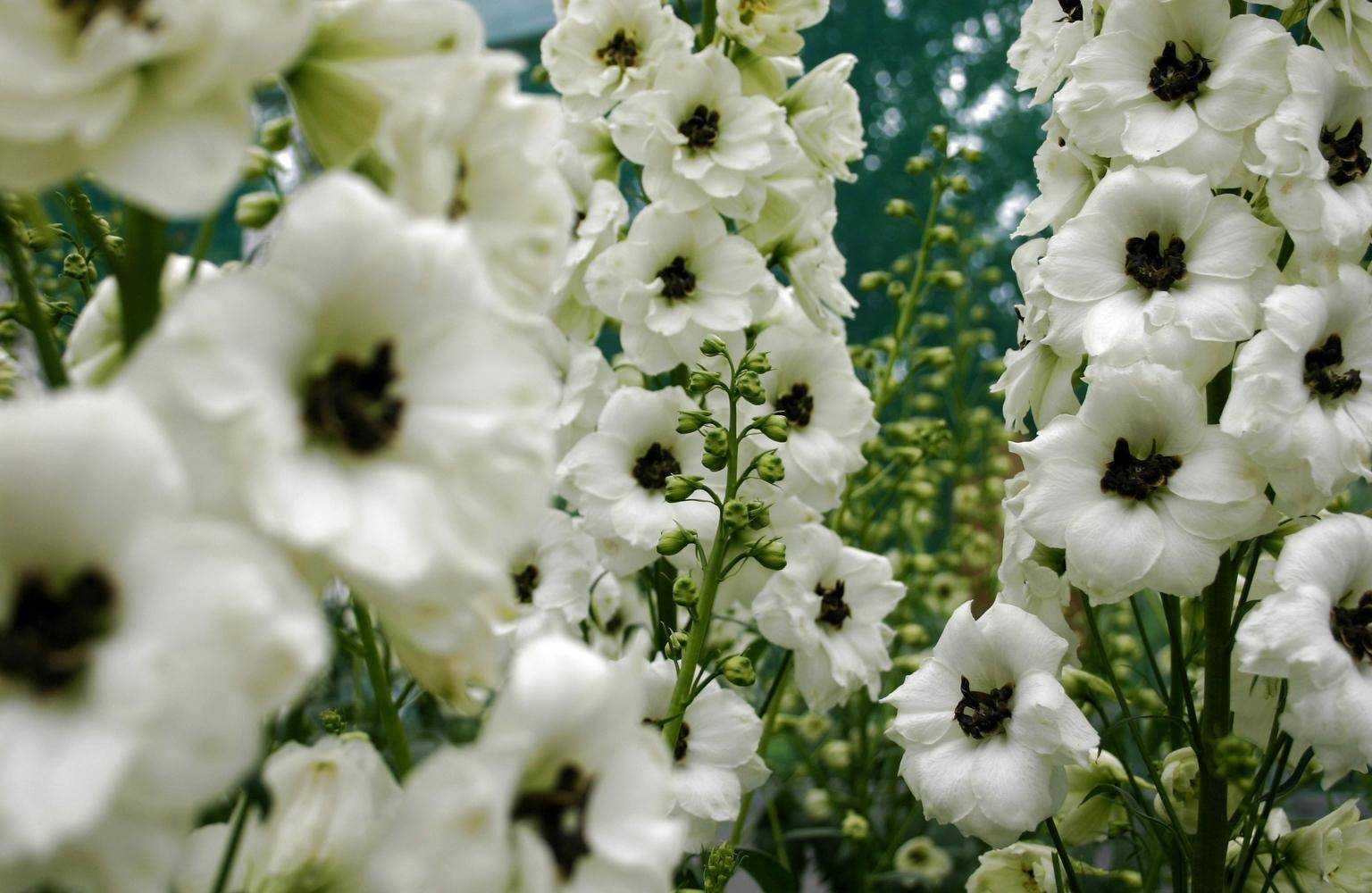- Дельфиниум Лероя вырастает почти до полутора метров и цветет белоснежными цветами с зеленоватым оттенком, от которых исходит напоминающий ваниль аромат.