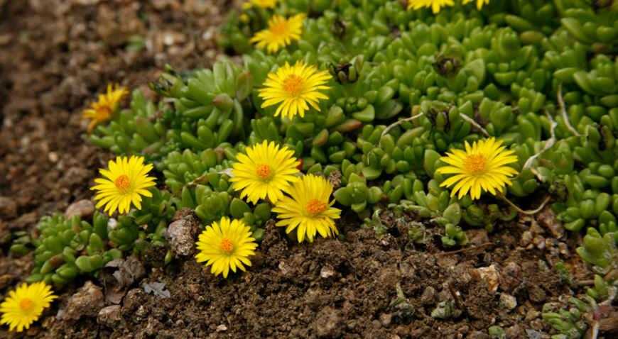- Делосперма скрученная (delosperma congestum). Невысокий (до 10 см), медленно растущий куст с плотной сочной ярко-зеленой листвой, приобретающей осенью темно-бордовый оттенок. Большое количество золотисто-желтых цветков практически полностью укрывает растение. Переносит морозы до -20…-23°С.