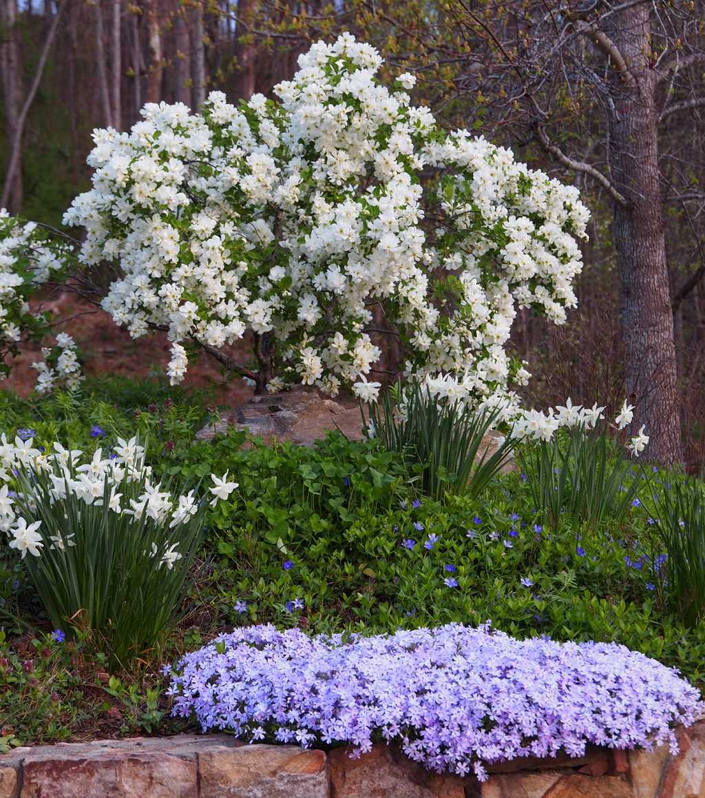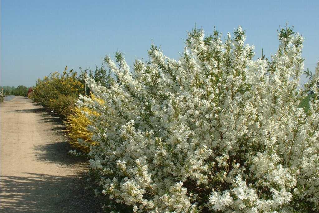 В изгороди лучше перемежать белоцветковые кустарники с растениями яркой окраски