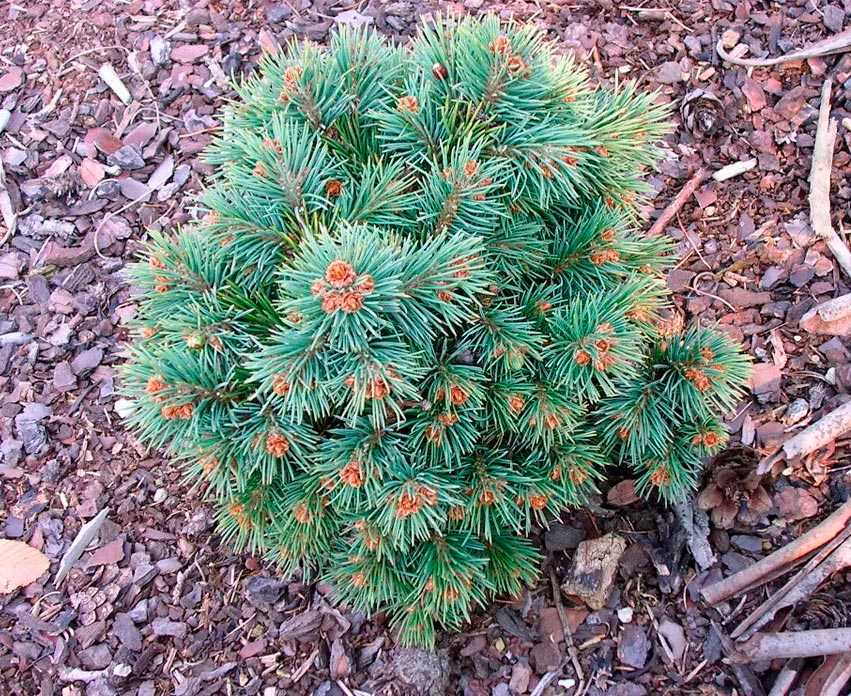 Такая миниатюрная разновидность с пирамидальной кроной в высоту может достигать около полутора метров. Хвоинки обладают эффектным бирюзовым окрасом.