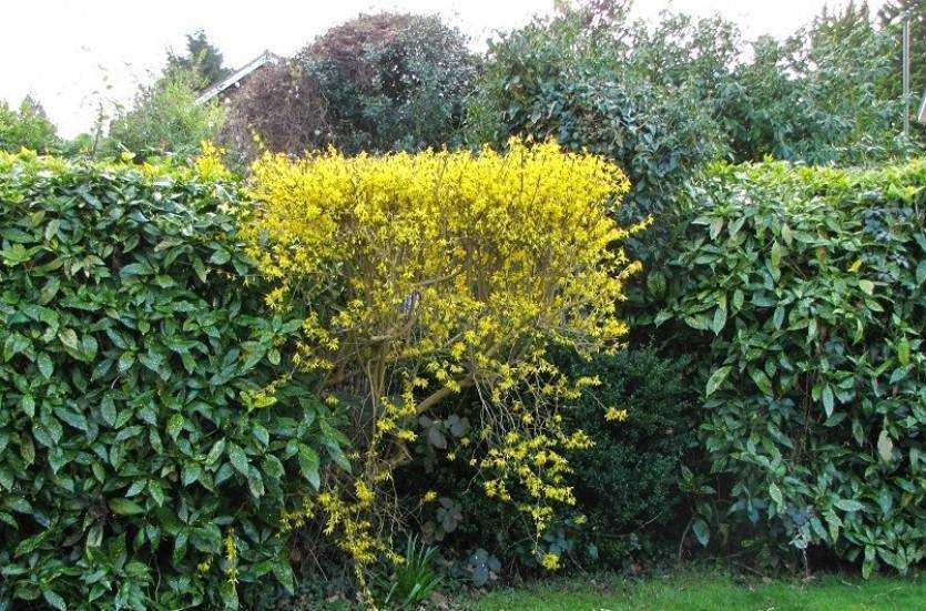 Живая изгородь из форзиции хорошо держит форму после обрезки