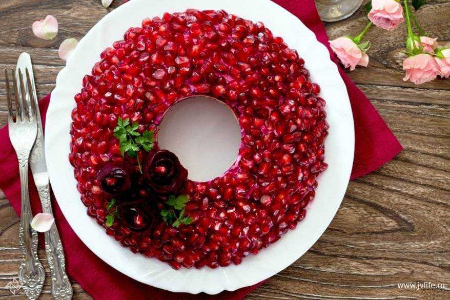 Уберите из центра стакан, обмажьте майонезом получившийся «браслет» и поставьте его в холодильник на пропитку — лучше всего на ночь. Перед подачей на стол украсьте салат зернами 3 гранатов, но не делайте этого заранее, поскольку зернышки могут высохнуть и салат потеряет свою красоту. Удивите домочадцев и гостей этим гранатовым чудом! Попробуйте и другие рецепты от Юлии Высоцкой: салат с авокадо, грейпфрутом и гранатом, салат с домашними колбасками и гранатом, а также вкусную закуску из риса, с апельсинами, гранатом и кедровыми орехами.
