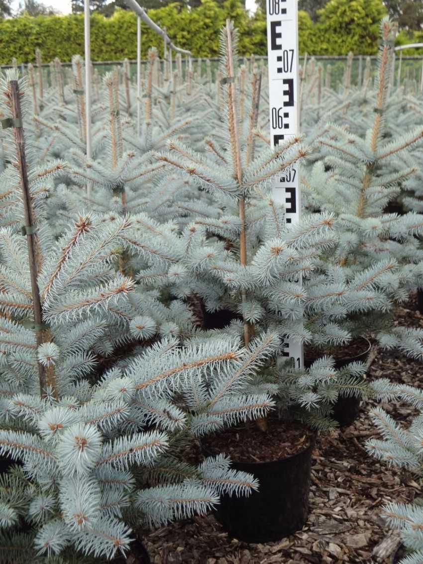 Невысокий сорт с практически идеальной конической формой кроны, отличающейся повышенной плотностью за счет тонких, густо растущих на ветках иголок. В первые годы у голубой ели формируется побег-лидер, которые и станет впоследствии основой для формирования правильной ровной кроны. К 10 годам вырастает до 1,5-2 м. Последующий ежегодный прирост составляет 20-25 см.