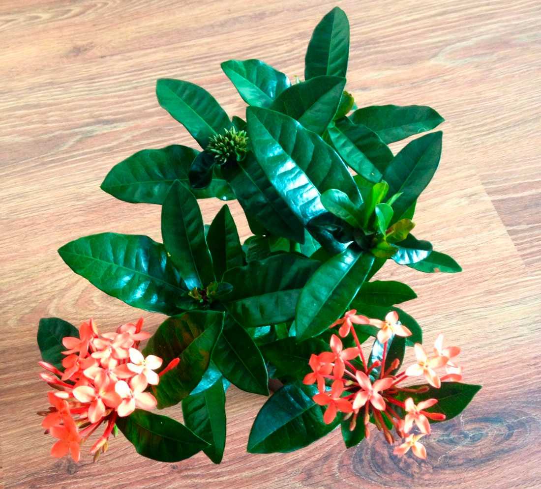 Иксора ярко-красная (Ixora coccinea) в природе – компактный куст не выше 1-1,3 м. Листовые пластины сохраняют оригинальный бронзовый отлив дольше, чем у «родственников».