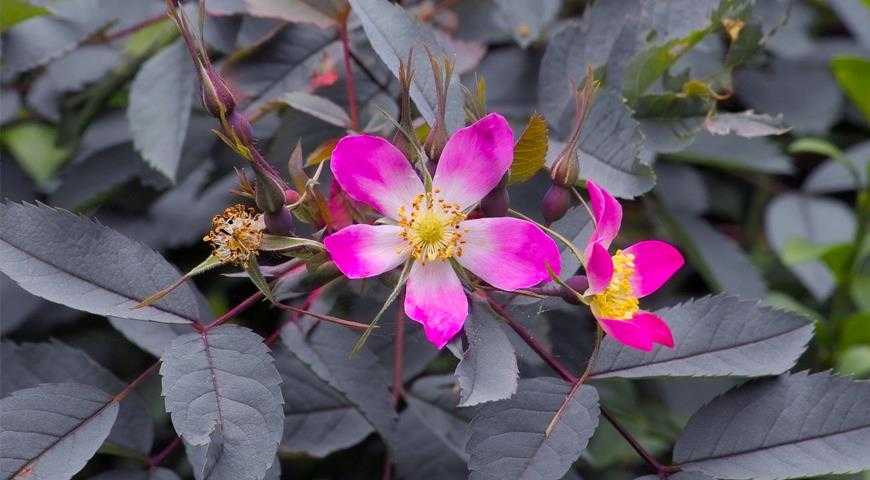 Шиповник сизый, или краснолистный (Rosa glauca) (USDA 3) несмотря на невзрачное цветение удивит нетипичной для шиповника темно-сизой листвой с пурпурными прожилками, а осенью куст будет усыпан каскадом ярко-красных плодов.