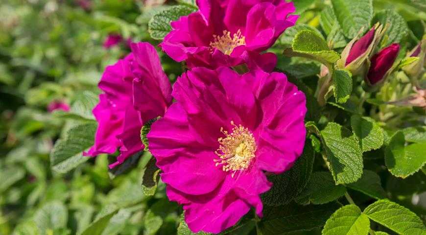 Шиповники отлично подходят для живой изгороди, их можно посадить в композиции с многолетниками или хвойными. Также используются для укрепления оврагов и склонов, защищая их от размытия.