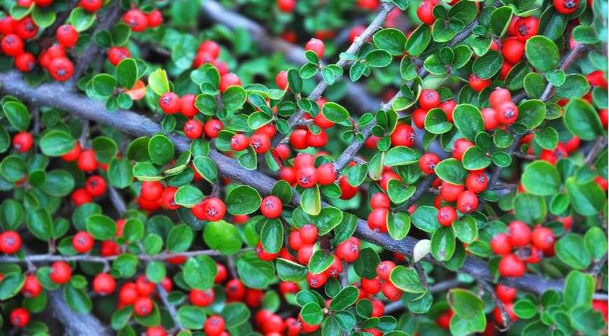 Кизильник горизонтальный — медленнорастущий стелющийся кустарник с горизонтально растущими ветками высотой до 80 см с мелкими темно-зелеными глянцевыми округлыми листьями. Цветет бледно-розовыми цветами, а в середине лета появляются огненно-красные небольшие плоды, которые могут продержаться до следующей весны. Осенняя листва приобретает яркий багровый цвет, что добавляет декоративности саду.