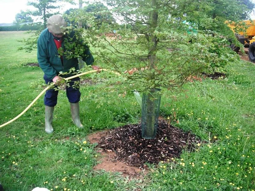 Деревья старше 15 лет нуждаются не только в поливе, но и дополнительной подкормке. Для этого рекомендуют сделать в почве отверстия, куда поместить удобрения, засыпав их слоем земли. После этого устанавливают и подключают дождевальные установки