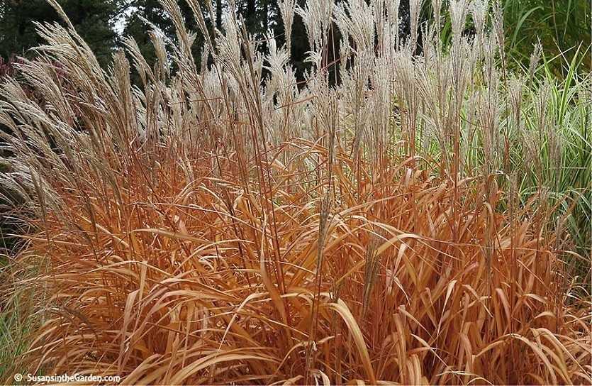 - Фернер Остин. В высоту кустик может достигать 150 сантиметров. На узеньких зеленых листовых пластинах по центральной жилке располагается белая полоска, которая в осеннее время становится рыже-красной. В августе происходит расцветание метелок веерообразной формы насыщенно-красного цвета с белыми верхушками, со временем они сменяют свой окрас на бронзово-серебристый.