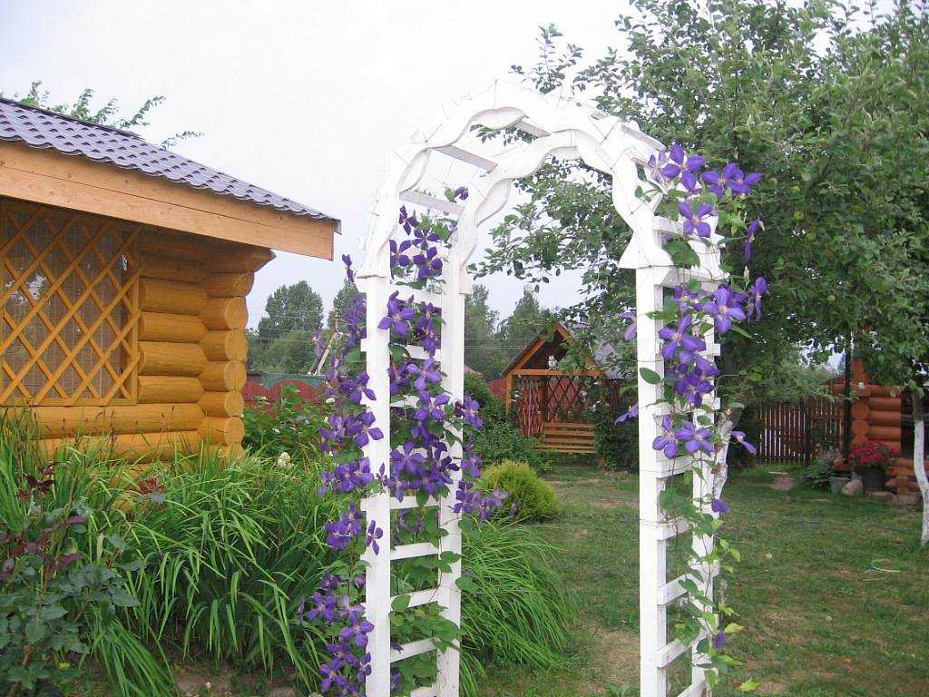 Арочную металлическую или деревянную опору можно установить возле калитки в сад. Это позволит сразу создать атмосферу перехода из зоны мощеного двора в озелененную зону. Пергола отличается от арки плоским верхом и скорее напоминает навес. Оба сооружения удобны для установки над лавочками в зоне отдыха.