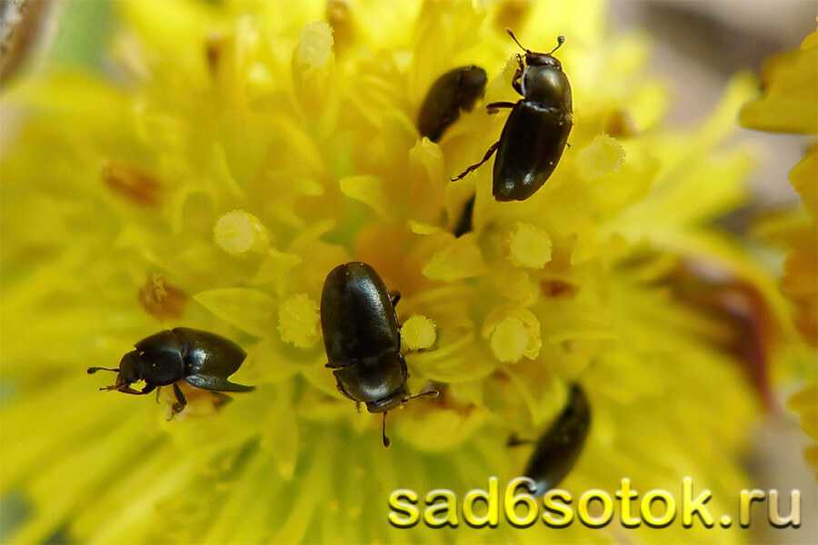 Эти черные или коричневые жуки особенно заметны весной и в середине лета, когда кормятся внутри цветков. Они обычно довольствуются небольшими количествами пыльцы, но иногда прокладывают ходы в бутонах.