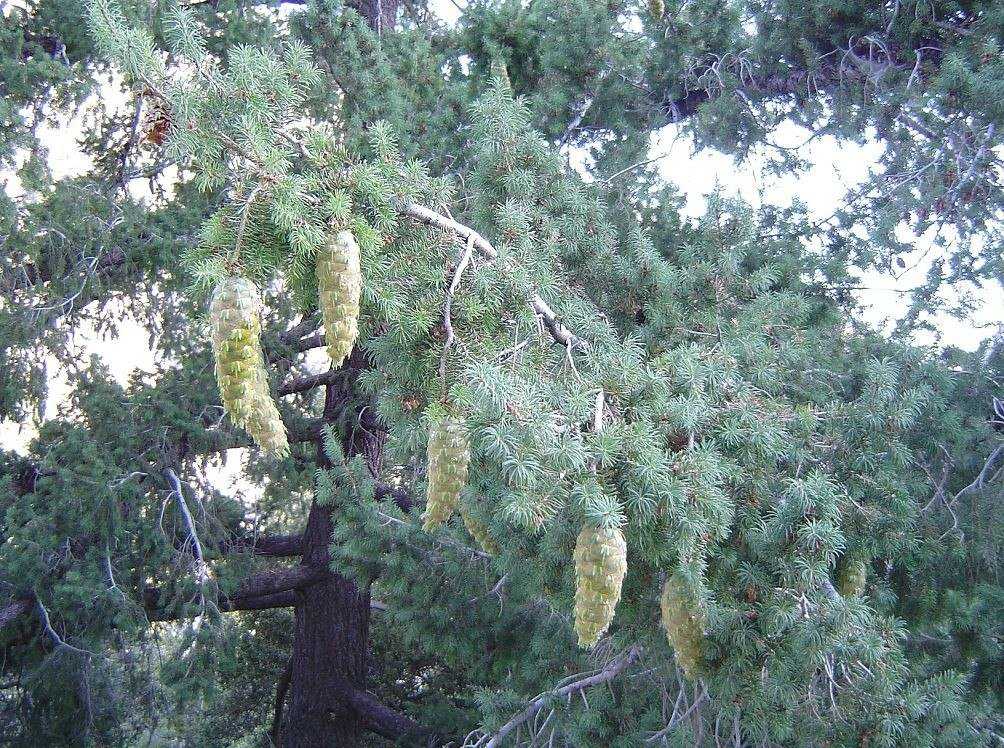 Псевдотсуга крупношишечная. Дерево высотой 15-30 м встречается на невысоких горных склонах. Оно имеет утолщенную пробковую кору с буро-серым покрытием. Сизо-зеленые игольчатые листочки в длину составляют 2,5-5 см. Они остаются на ветках до 5 лет. Длина крупных продолговатых шишек составляет 10-18 см, под коричневыми трехзубчатыми чешуйками скрываются крупные семена. Растение предпочитает более влажный и мягкий климат.