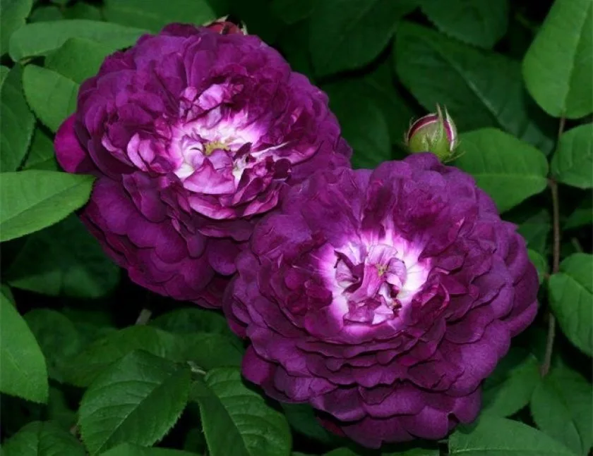 Цветки раскрываются бархатисто-темно-красными, постепенно становятся насыщенно-пурпурными, с более светлыми тонами или розовым оттенком с оборотной стороны лепестков, и белыми потеками у основания. Эта изумительная роза цветет только один раз за сезон, ранним летом, но пока она цветет, вы будете наслаждаться великолепными цветками и роскошной листвой.