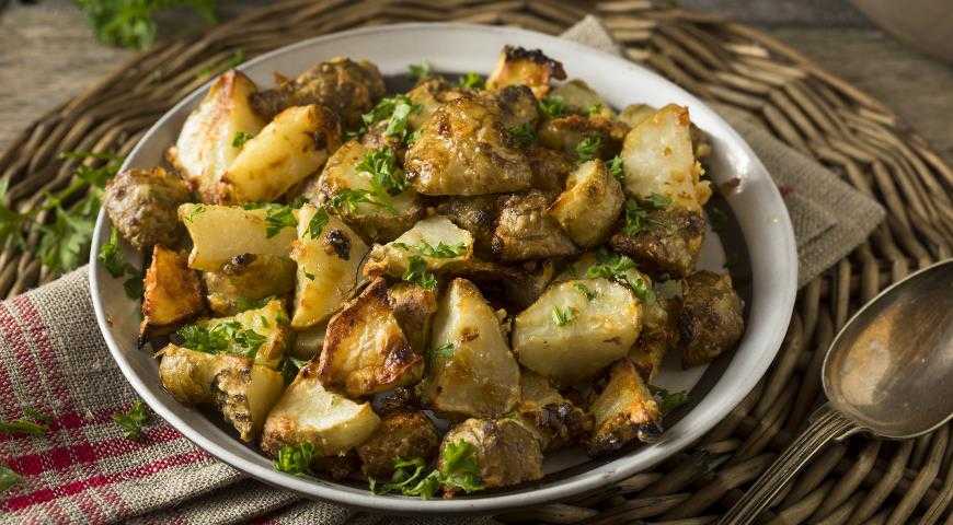 Смешать клубни с оливковым маслом, солью и перцем. Выложить клубни на противень и поставить в духовку, заранее нагретую до 220 °С. Запекать 1 час.