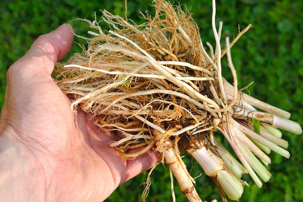 Корневая система развита достаточно хорошо, толщина отдельных корневищ достигает 3,5 см. средняя часть рыхлая, с многочисленными придаточными разветвлениями и побегами. Корешки, отделенные от корневища ломкие, длинные, бурого цвета, и желтоватого оттенка внутри. Корневища обладают стойким, сильно пряным ароматом, на вкус горчат.