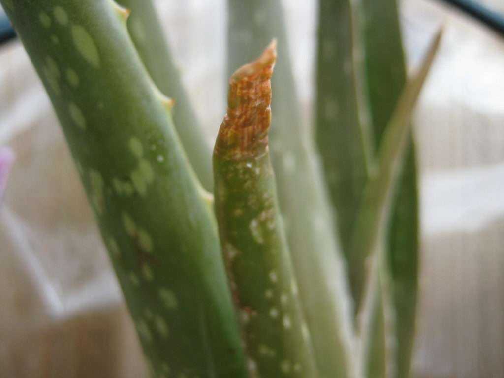 Высохший конец листа алоэ указывает на то, что растение пора пересаживать. Корневая система слишком разрослась, и ей не хватает места в горшке, соответственно, она не получает нужное количество веществ для питания листа целиком. Как только у корней появится простор, проблема засохших кончиков исчезнет.