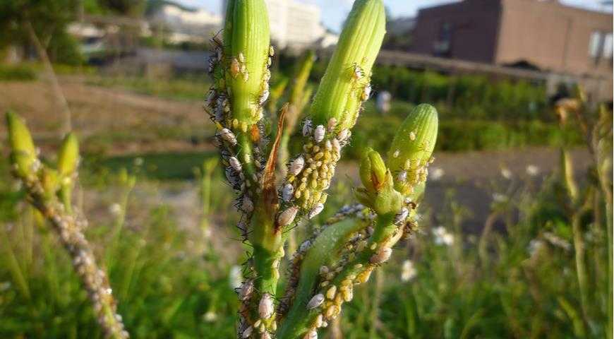 На лилейниках пасется особая лилейная тля, которая питается только лилейниками (Myzus hemerocallis). Лилейные тли атакуют бутоны и высасывают сок из листьев. Практически нет садовников, которые не узнали бы этих мелких насекомых, цвет которых варьируется от бледно-зеленого до почти черного. Обычно они представляют собой большую проблему в прохладную погоду весной. Жадный аппетит лилейной тли может привести к деформации листьев и появлению бородавок на бутонах. Тли также выделяют падь (сладкую жидкость), на которой развивается сажистый гриб, в результате чего на растениях появляются темные, очень неприглядные пятна.