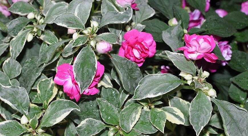 Бальзамин УоллераБальзамин Уоллера. Среднерослый компактный куст с пышной, шаровидной кроной и голыми сильноветвящимися стеблями. Блестящие тонкие листья имеют различную окраску (в зависимости от гибрида). Крупные махровые или одиночные цветы формируются на макушках стеблей и различаются оттенками от белого до фиолетового. Встречаются разновидности двухцветные.
