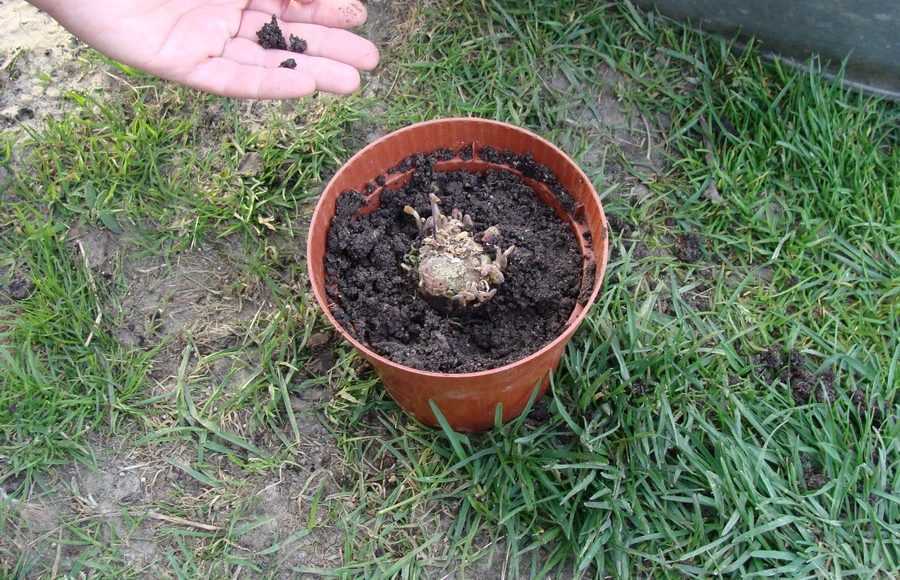- после пересадки верхняя треть клубня растения должна оставаться над грунтом;