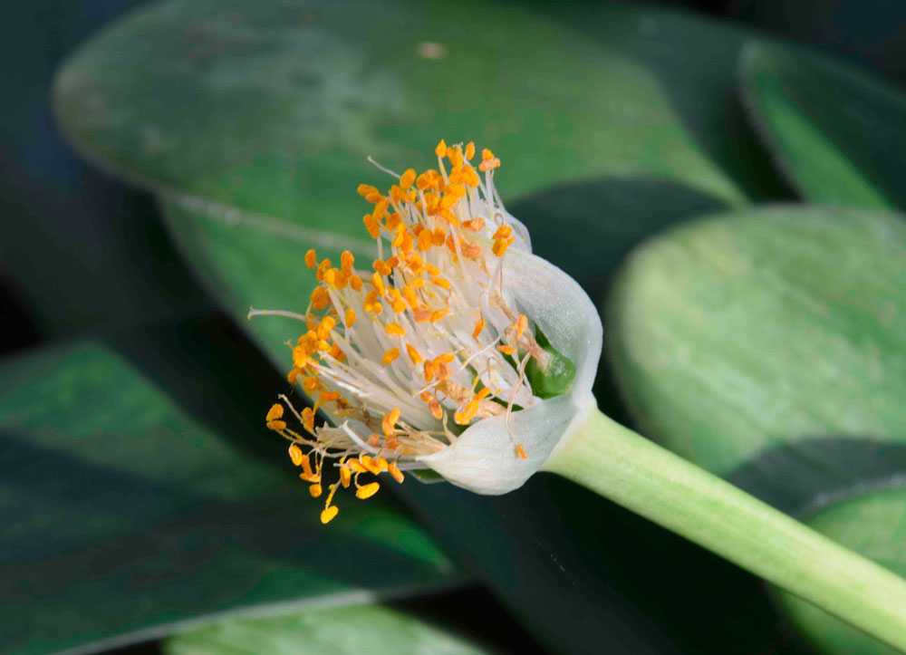 Еще одна загадка, окружающая лилию кобры, — это ее средства опыление. это цветок необычной формы и сложной формы, что обычно является признаком тесной специализации растений-опылителей, но ни один из них не был идентифицирован. Цветок желтовато-лилового цвета и растет на стебле, длина которого равна длине стебля. В нем пять чашелистики, зеленого цвета, которые длиннее лепестков с красными прожилками. Хотя опыление еще не наблюдалось в действии, обычно ожидается, что опылитель это либо муха, которую привлекает неприятный запах цветка, либо какое-то ночное насекомое, поскольку никаких обширных исследований для наблюдения за потенциальными ночными опылителями не проводилось.[нужна цитата ]