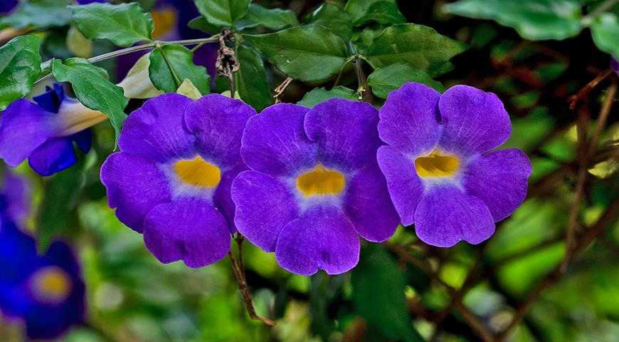 Интерес представляют также тунбергия душистая (Thunbergia fragrans) и тунбергия прямостоячая (Thunbergia erecta) с одиночными, ярко-фиолетовыми цветами.