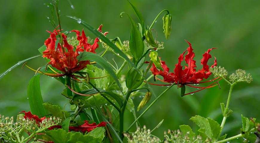 То, что в России недобросовестными продавцами продается как ампельная лилия — это глориоза. В природе многолетнее растение с вьющимися побегами и цветками, с отогнутыми назад лепестками. В тропиках Азии и Африки распространены 5 видов этого рода. Наиболее известна глориоза роскошная (Gloriosa superba), ее цветки до 8 см в поперечнике, сначала зеленые, со временем становятся ярко-красными. Клубни ядовиты.