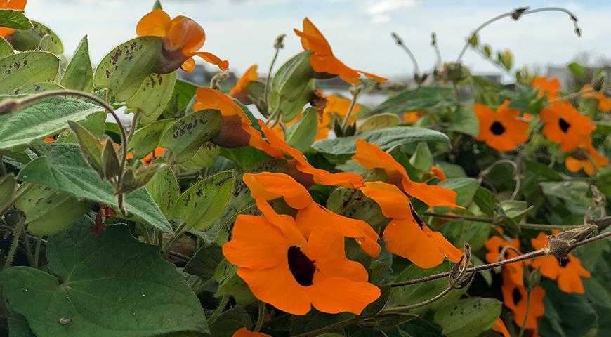 Сфотографировали желтые цветочки с темным центром на лиане? Это тунбегия — травянистая лиана, цветущая желтыми или оранжевыми воронковидными цветками. Родина тунбергии — Юго-Восточная Африка.