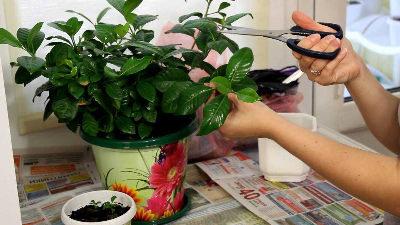 Гардения нуждается в санитарной обрезке после цветения. Необходимо убирать все черенки с увядшими цветами, больные или слабые листовые черенки. В процессе можно также срезать 2-3 здоровых черенка и укоренить их.