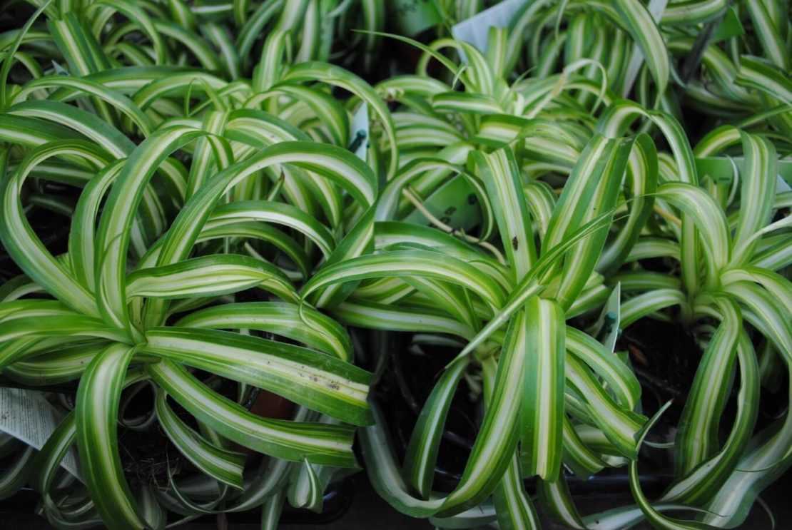 Растения отличаются расцветкой и формой листвы. Некоторые имеют белые полоски, другие вьются, третьи имеют более широкую листовую пластину. Интерес для садоводов представляет сорт, который выращивает деток – они располагаются каскадом на длинных побегах по периметру растения.