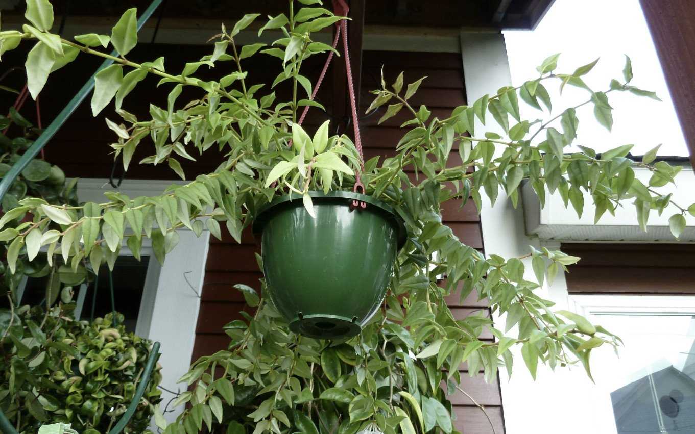 Ветви, свисающие с кашпо, укорачивают наполовину. Это ещё и стимулирует обильное цветение в следующем сезоне.